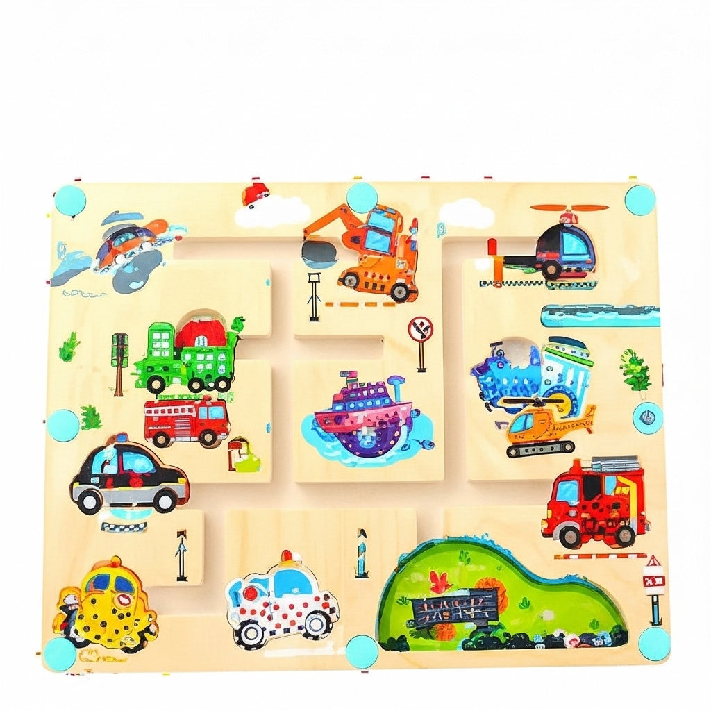 لعبة متاهة تعليمية مصنوعة من الخشب الفاخر. تحتوي على سيارات شرطة، شاحنة، مروحية، وأشكال أخرى يمرر الطفل الكرات الصغيرة من خلالها. تعزز التركيز، الصبر، والتفكير المنطقي مع متعة اللعب.